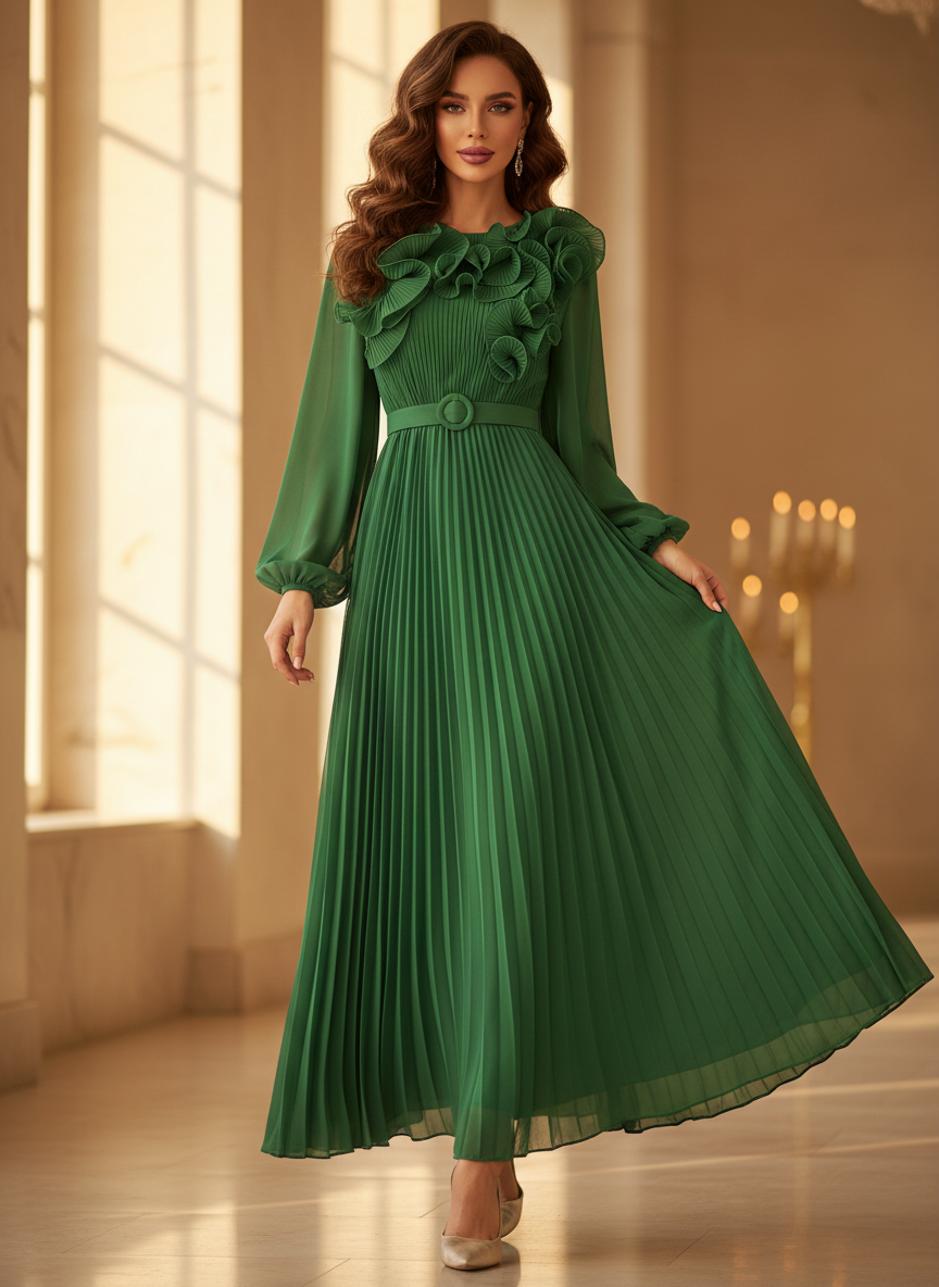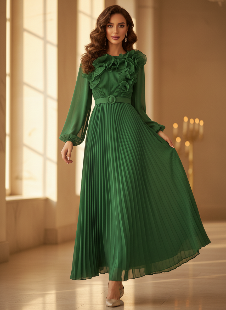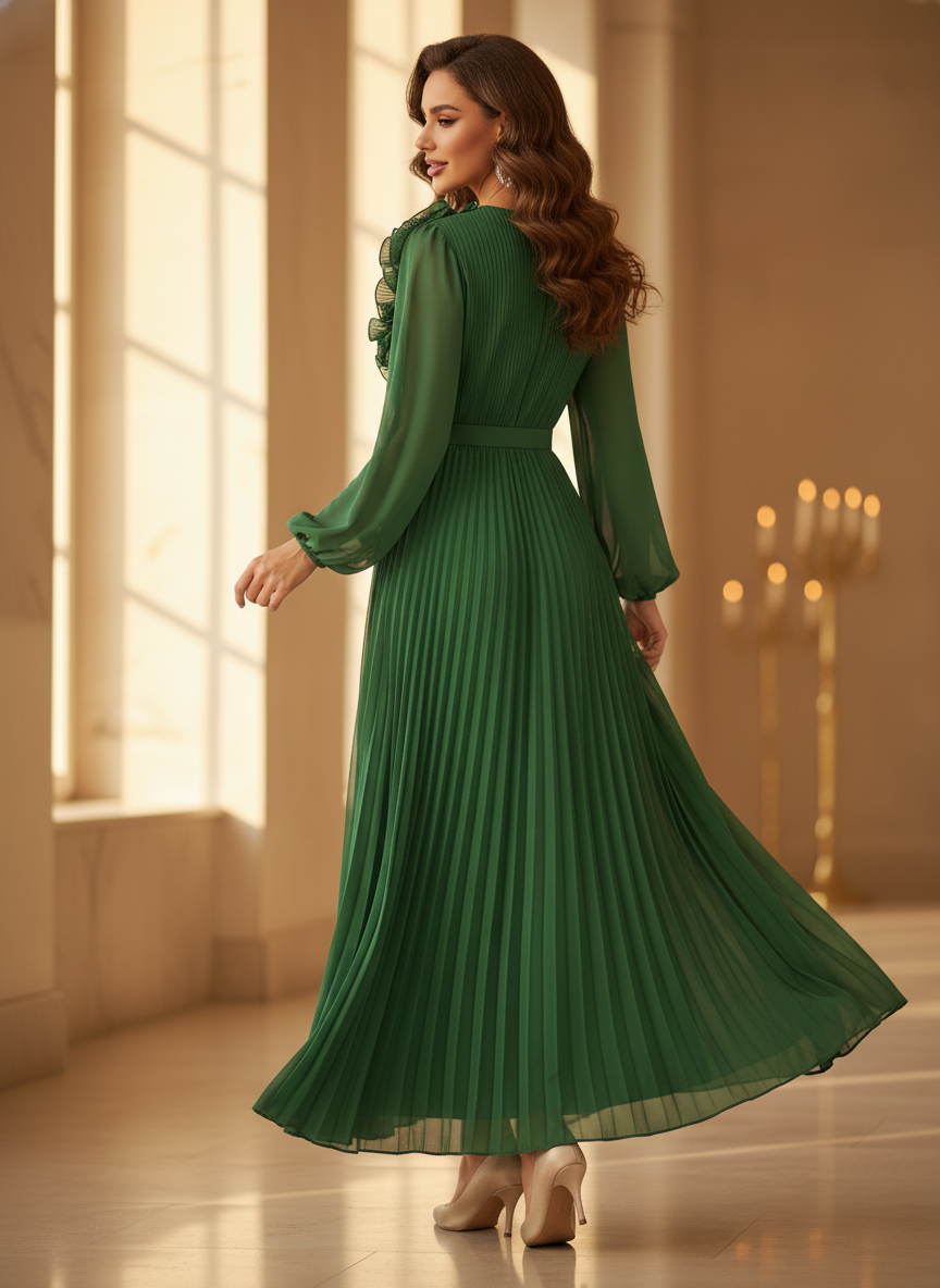 Gruenes langes Kleid mit Plissee-Details